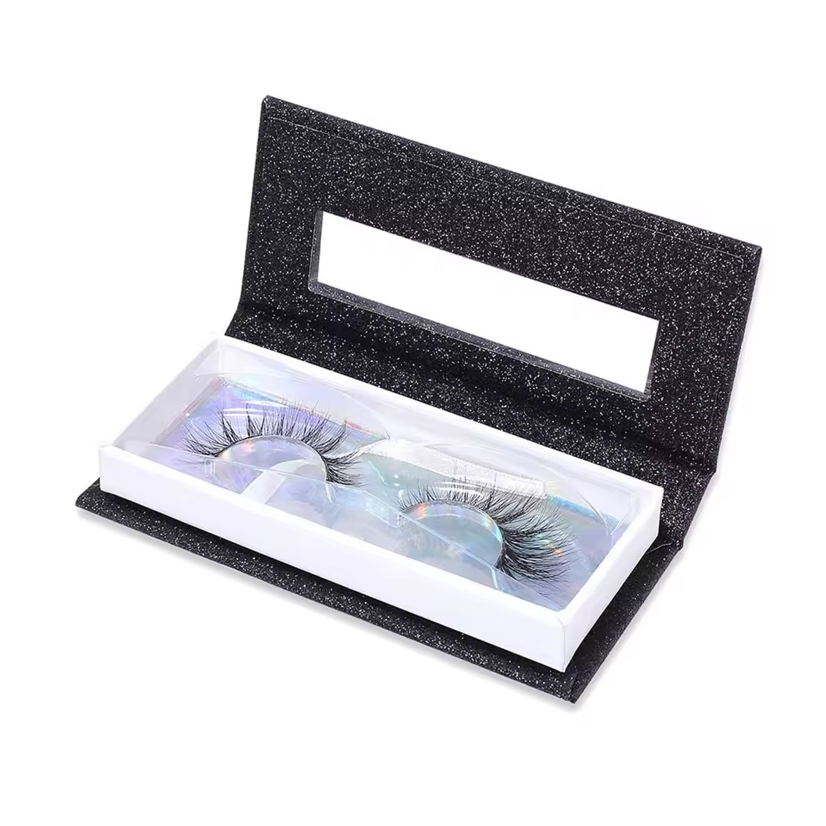 Elevate your brand with our hot-selling, luxury magnetic false eyelash boxes. This custom-design box features a sleek black glitter finish and a clear viewing window, providing a high-end presentation for your lashes. We offer full customization, including adding your own logo and a variety of color options. This is the perfect packaging solution to impress customers and enhance your brand's image.